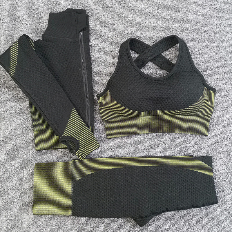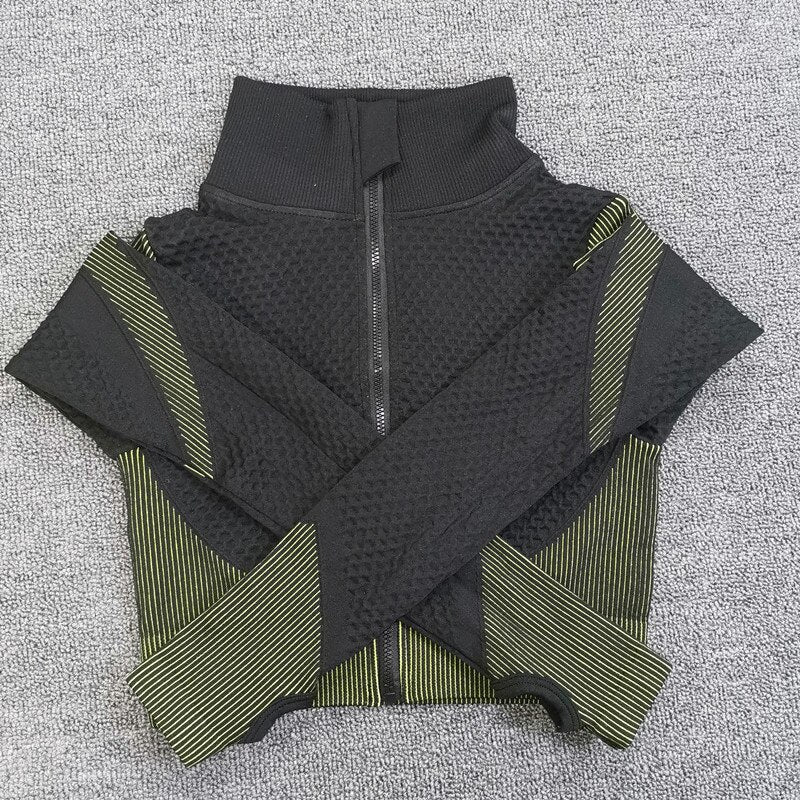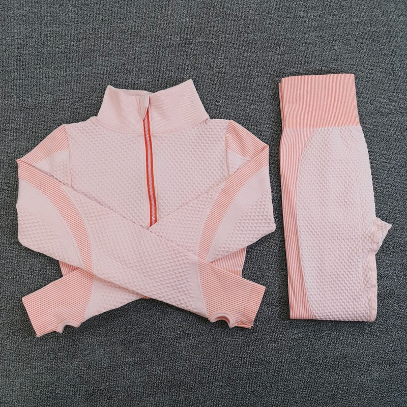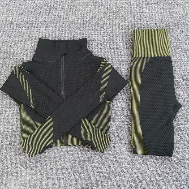 Sport Seamless Workout Set Women Rib 3 2 Piece Long Sleeve Zipper Crop Top Shirt Legging Pants Fitness Set Clothes Yoga Gym Set