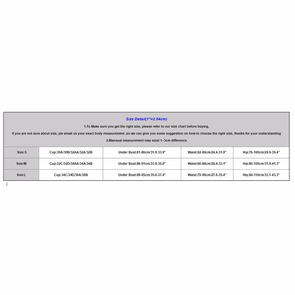 Women Push-up Padded Bra Floral Bikini Set Swimsuit Swimwear Bathing NOTE: Please compare the detail sizes with yours before you buy!!! Use similar clothing to compare with the size Features: 1. Floral design, sexy and elegant fashion integration, Split design highlights proud of the body, soft and comfortable good nylon 2.Fashion sexy fashion swimsuit, wearing a mysterious figure. 3.Every day a beautiful beach, I believe you will like it! Item specifics Gender: Women Season: Summer Occasion: Daily,Swimming pool ,Sea Material: Nylon Decoration: Floral Clothing Length: Regular Pattern Type: Solid Style: Sexy,Causal Package include: 1Set Swimwear (Containing Chest Pad) HOW TO MEASURE FOR TOP Your Band Wearing a non-padded, non-minimizing everyday bra, measure just above the bust by bringing a soft measuring tape across your back at band level, under each arm (elbows down), then around the front to snugly but comfortably line up with where your bra straps meet your cups. TIP: Odd number or on the half inch? Round down to the nearest even number. TIP: Did you measure yourself below the bust instead? Follow our guidelines for above-the-bust measuring before entering your Band Size into the Perfect Fit Calculator. Your Bust Measure across the fullest part of the bust by threading a soft measuring tape across your back at band level and under each arm, being careful that your elbows are down and that the tape isn't pulled away from the body in the front. With the tape in position, take a breath in and out, allowing it to slide to its most comfortable, non-binding fit. TIP: If the measurement falls on the half inch, round up. HOW TO MEASURE FOR BOTTOM Waist Measurement Bend to one side to find natural indentation in torso. This is your natural waist. Run tape around natural waistline, keeping tape parallel with floor and one finger between body and tape for a more comfortable fit. Hip Measurement Stand on a level surface with feet together. Measure around fullest part of hips and bottom (approximately 7"-9" below waistline), keeping tape parallel with floor. Size Detail(1"=2.54cm) 1.To Make sure you get the right size, please refer to our size chart before buying, if you are not sure about size, pls email us your exact body measurement ,so we can give you some suggestion on how to choose the right size, thanks for your understanding 2.Mansual measurement may exist 1~3cm difference Size:S Cup:30A/30B/32AA/32A/32B Under Bust:81-86cm/31.9-33.9" Waist:62-80cm/24.4-31.9" Hip:76-100cm/29.9-39.4" Size:M Cup:32C/32D/34AA/34A/34B Under Bust:86-91cm/33.9-35.8" Waist:66-84cm/26.0-33.1" Hip:80-105cm/31.9-41.3" Size:L Cup:34C/34D/36A/36B Under Bust:89-95cm/35.0-37.4" Waist:70-90cm/27.6-35.4" Hip:84-110cm/33.1-43.3"